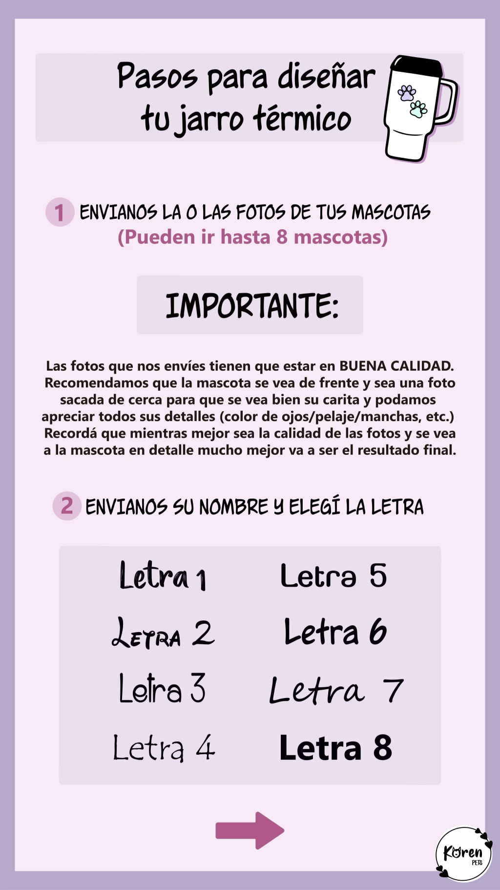 SI LLEVA UNA SOLA MASCOTA: En lo posible envíar UNA sola foto, no varias. La foto tiene que estar en buena calidad y que se vea bien su carita. Si se envían varias fotos, vamos a elegir la que se vea mejor para realizar la ilustración.